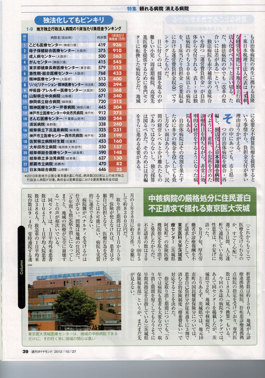 ダイヤモンドは、自治体病院の経営改善の処方箋についても、触れています。その言葉を借りれば、「柔軟な経営を可能にする地方独立行政法人化がベスト」とのこと。独法化した日本海総合病院のように、産科、小児科を含めた診療科目を持ちながら、非常に効率的な経営をするようになった病院もある、とのこと。これもひとつの選択肢だと思います。