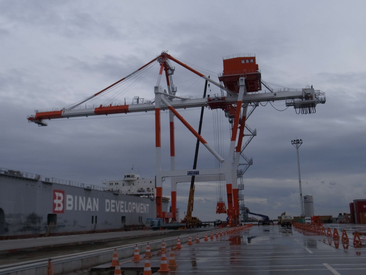 ガントリークレーンとは、コンテナなどの貨物の積み卸しを行うクレーンのことで。貨物の荷役を行う上で欠かせない機械です。一本釣りのクレーンと比較すると、作業スピード・安全性が格段に優れているため、重要港湾には複数設置されてます(例:香港92基、シンガポール87基、東京港約30基、神戸港18基、横浜港5基、八戸港2基(国土交通省調べ))。小名浜港も1基のガントリークレーンを保有していたのですが、震災で損傷し、現在まで運用が止まっていました。