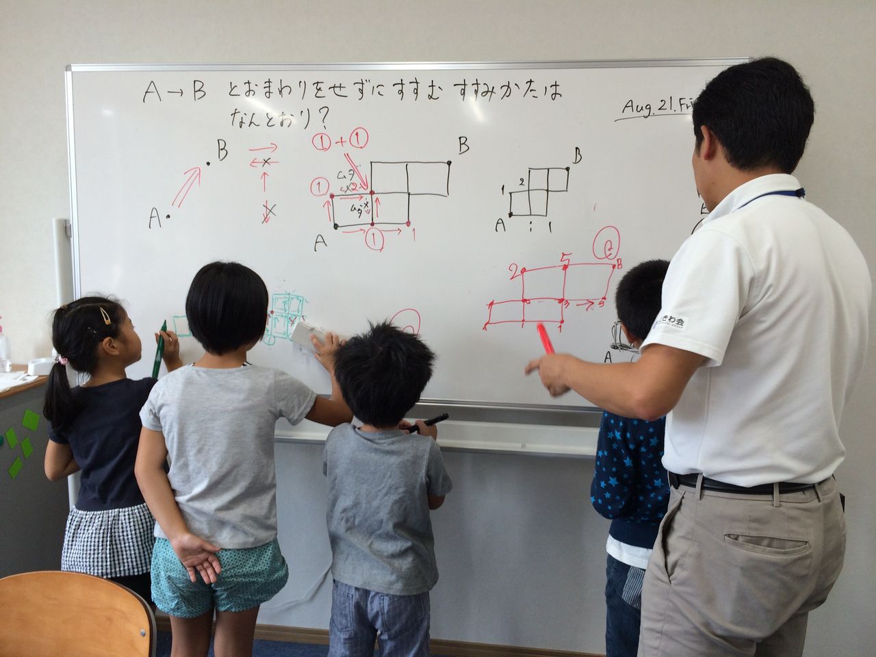 算数の時間に飛び入りで参加させてもらいました。「遠回りをせずに進む進み方は何通りあるか?というパズルを解きます。最初は試行錯誤してやるのですが、そこに法則性を見つけて、いかに早く、ミスなく正解にたどり着けるかを競います。私も参加したのですが、みんな早い!聞くとこの問題は、算数オリンピックに使われているものの初級バージョンだそうです。頭を柔らかくしないと、正解にたどり着けません。子ども達にとっても、パズルを解くのは楽しいし、その過程で頭を使うことで、思考のレベルが知らず知らずに上がっていくのだと思います。子ども達にやらせておいて、さりげなく教えるというのが、うまい。