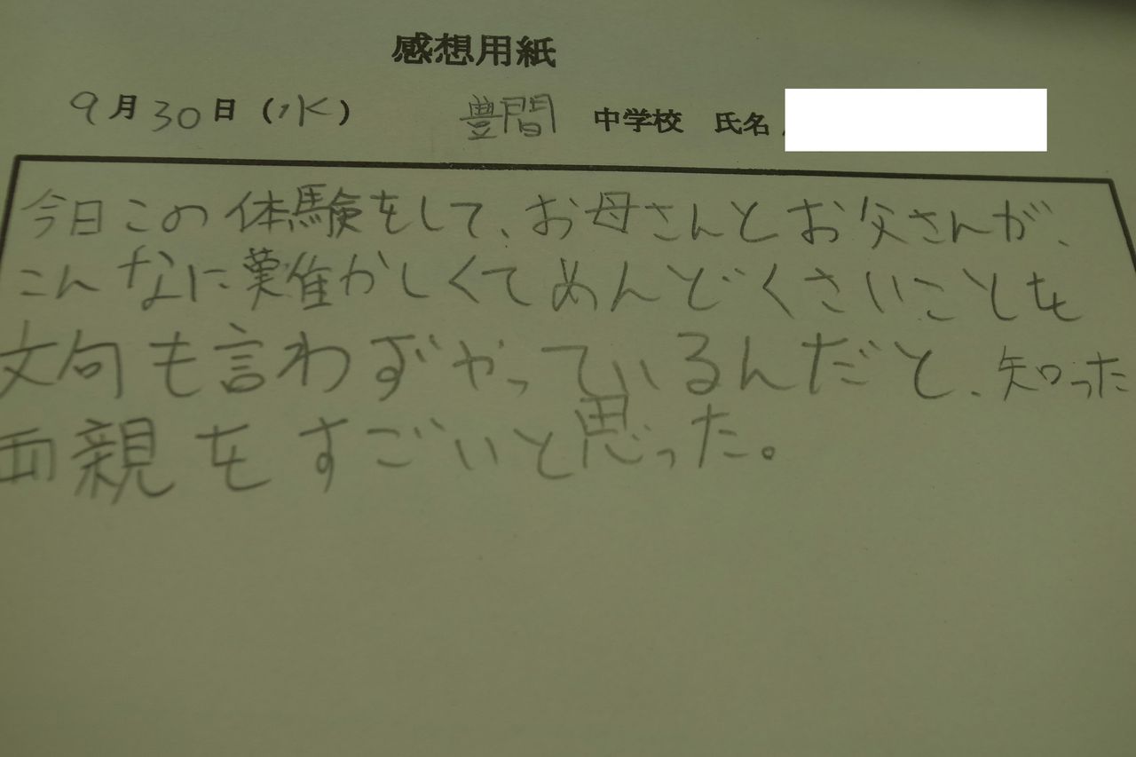 この体験学習の終了後に、感想文を書いてもらいました。その中で圧倒的多数の感想は、①楽しかった!です。これまでオカネに対して、あまり深く考えたこともなかったけれど、どういうふうに毎月のオカネが流れているかわかって楽しかったということ。そして2番目の感想は、②オカネの大切さがわかった!ということ。毎月限られた収入・予算を赤字にならないようにどうにかしてやりくりしなければならないし、オカネを大事に使わなければならない、ということ。3番目の感想は、③両親への感謝!です。オカネのやりくりを毎月やってくれ、さらには基礎となる収入を得るための活動をしてくれている両親へ、改めて感謝したい、ということでした。