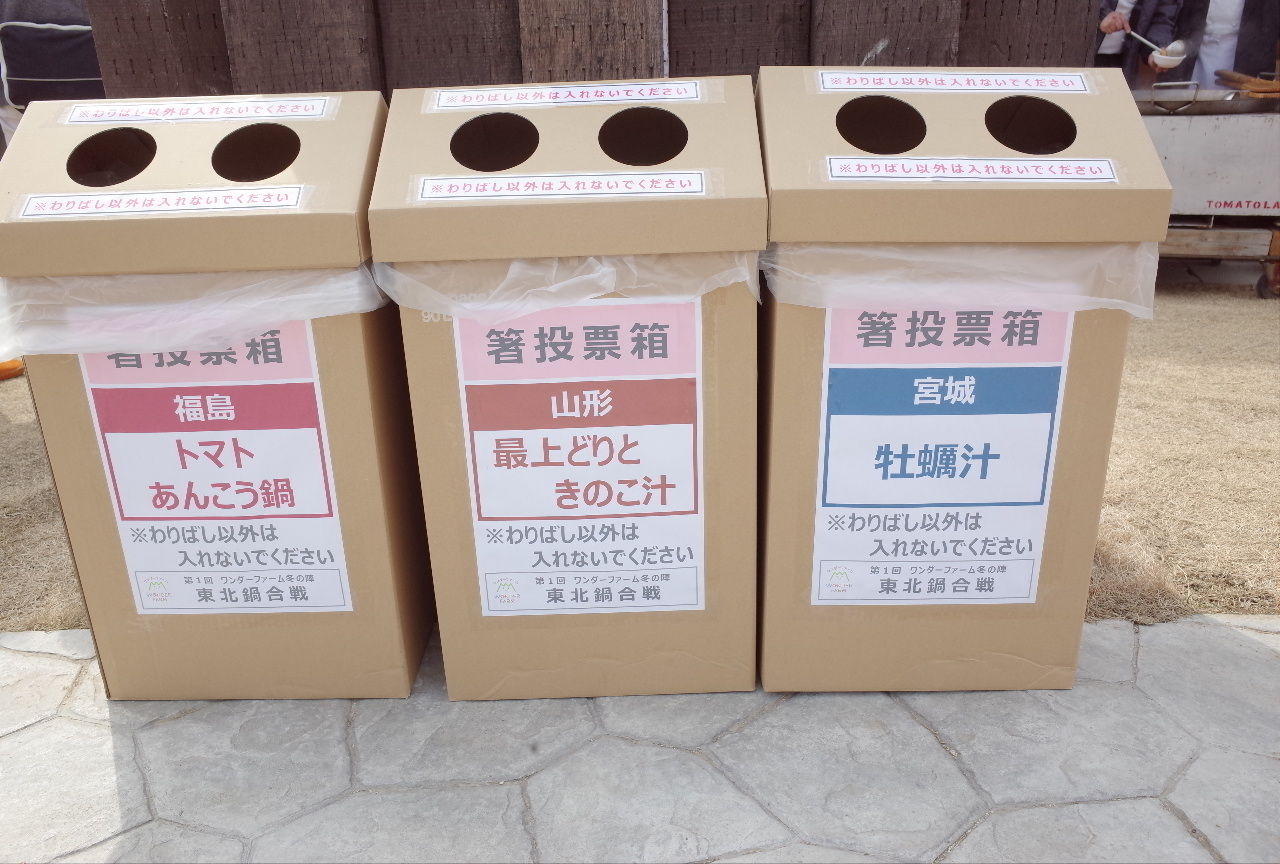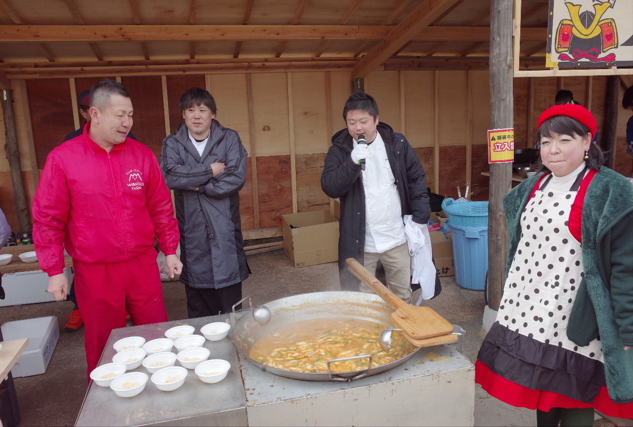 ワンダーファーム2周年記念が開催されました。今回の目玉企画は、ワンダーファーム冬の陣『第1回東北鍋合戦』。福島からトマトあんこう鍋、宮城から牡蠣汁、山形から最上どりときのこ汁の豪華鍋が集まり、お客様の投票で最も美味しい鍋を競うというもの。3杯セットで、ちょっきり1,000円(税込)!