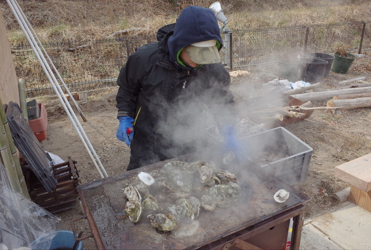 びっくりするくらいうまかったのが焼き牡蠣です。鉄板に大量の牡蠣を乗せ、蒸し焼きにするだけ。味付けは、なし。