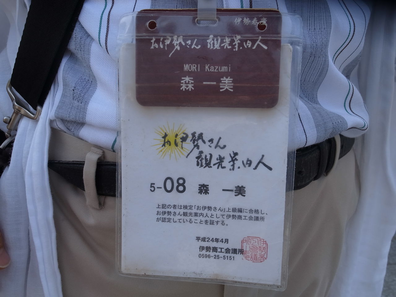 有償ボランティアの「お伊勢さん観光案内人」の方にご案内いただきました。これは伊勢商工会議所が主催する検定「お伊勢さん」に合格した者だけが名乗ることができ、単に「お伊勢さん」の知識を伝えるだけでなく、歴史的背景やそれが伊勢の方にどのように影響しているか等を、一緒に内宮・外宮をまわっていただきながら紹介していただきました。自らも伊勢市民かつ神領民で、白石持ち行事には3回参加したことがある、信心深い方でした。