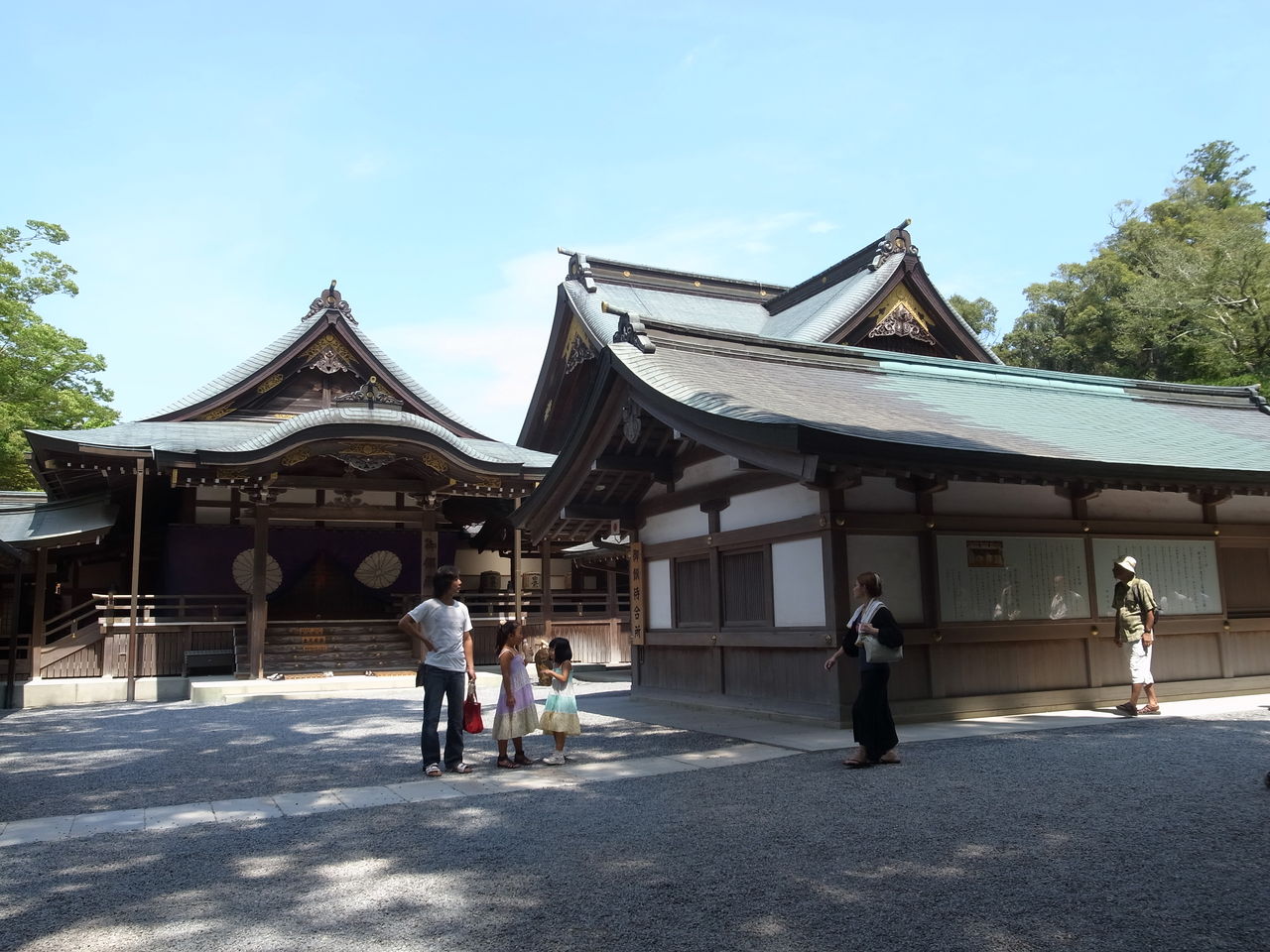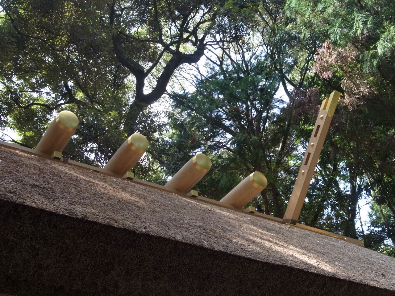 神明造は、古代の高床式穀倉の発展形で、屋根は切妻・茅葺き、柱は檜の素木を地中に埋める掘立式です。建物全体は(出雲大社等と比べて)直線的で、棟の上には鰹木(かつおぎ)が並び、屋根の両端には千木(ちぎ)が伸びています。
