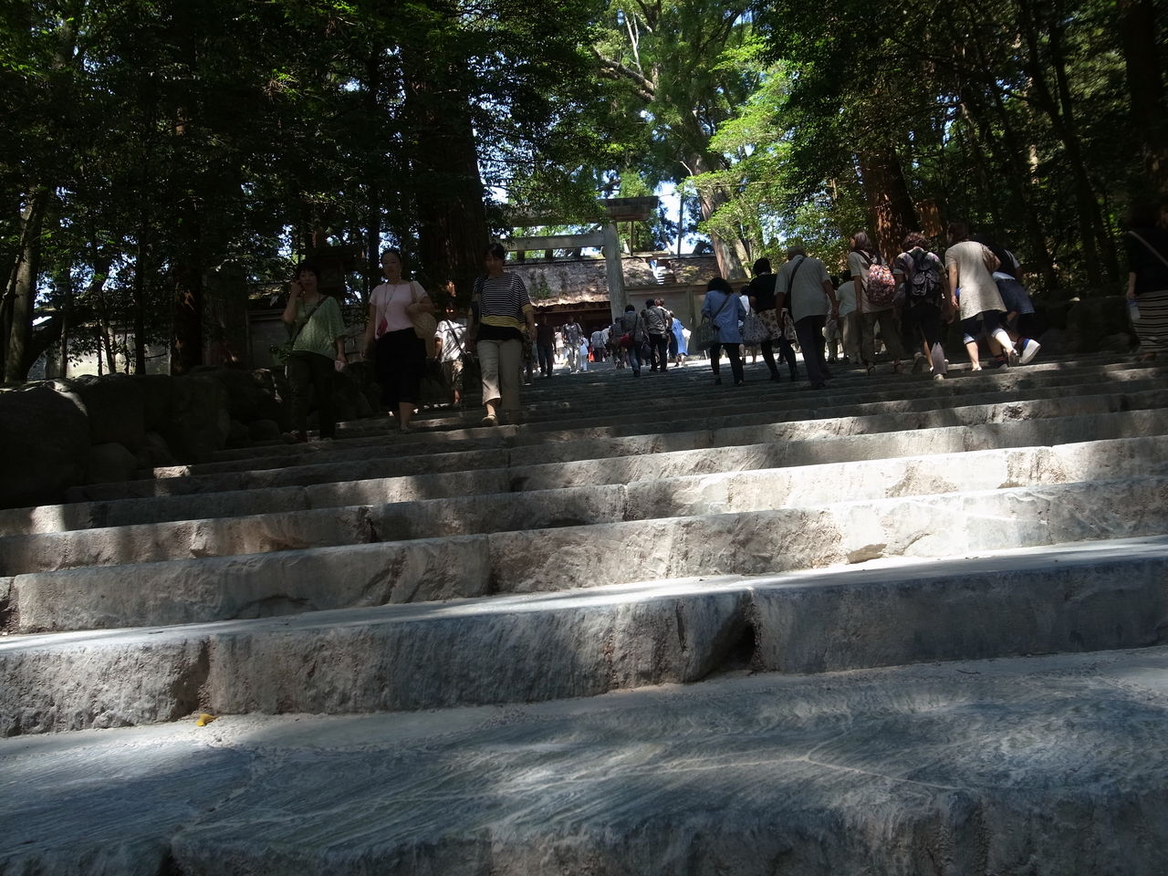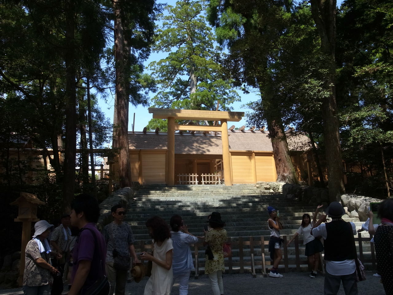 いよいよ日本一の神様である天照大神のご神前へ。階段から先は撮影禁止エリアです。重厚な石段を一段ずつ上り、白い御幌(みとばり)の前に立って、お参りをしました。