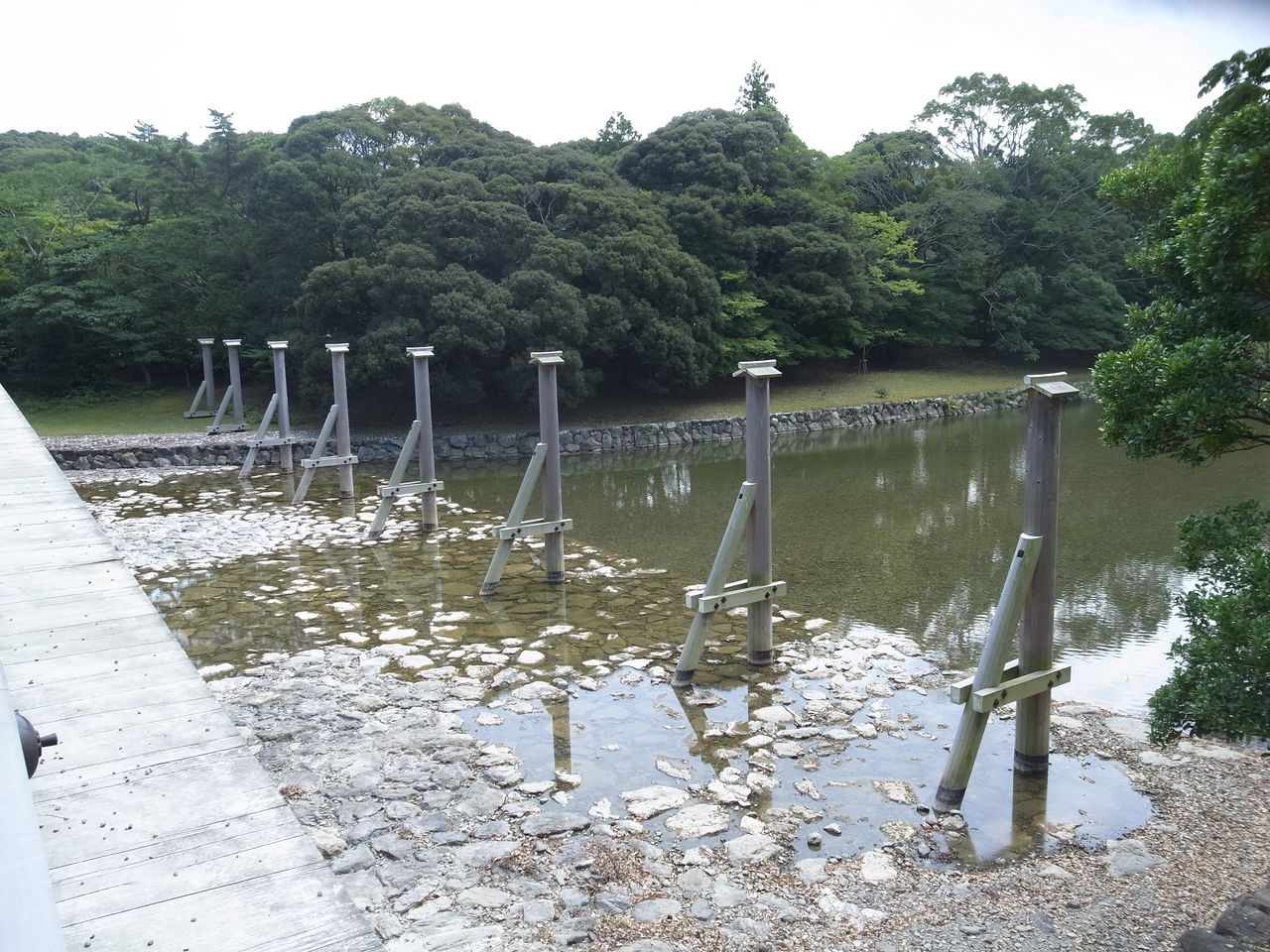木除け杭。大雨の際に流木が宇治橋の基礎を傷つけないように少し上流に置かれています。どれほど効果があるかどうかは定かではありませんが、全く同じ形式を引き継いで建築されています。