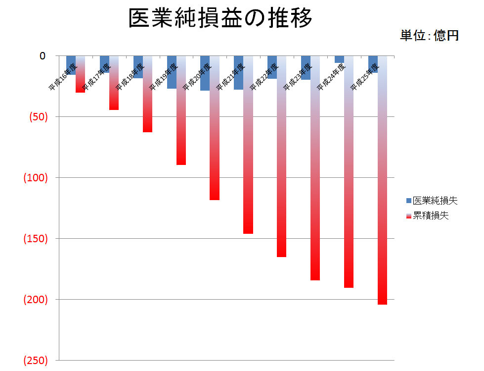 共立病院の経営状態を過去10年間のいわき市病院事業会計決算書をすべてあたってみました。これによると、医業収益から医業費用を差し引いた、純粋な医療行為の結果である医業純損益ベースでは、平成15年度が14.5億円の赤字、16年度が15.6億円の赤字、17年度が14.0億円の赤字、18年度が18.5億円の赤字、19年度が26.9億円の赤字、20年度が28.6億円の赤字、平成21年度が27.7億円の赤字、22年度が19.0億円の赤字、23年度が19.4億円の赤字、24年度が5.4億円の赤字、そして平成25年度が当初予算ベースで14.0億円の赤字となっており、平成16年度から直近までの10年間の累積赤字が、約200億円になります。これはちょうど新病院建設コストに匹敵する金額であります。10年間の赤字で病院建設一つ分の金額であります。