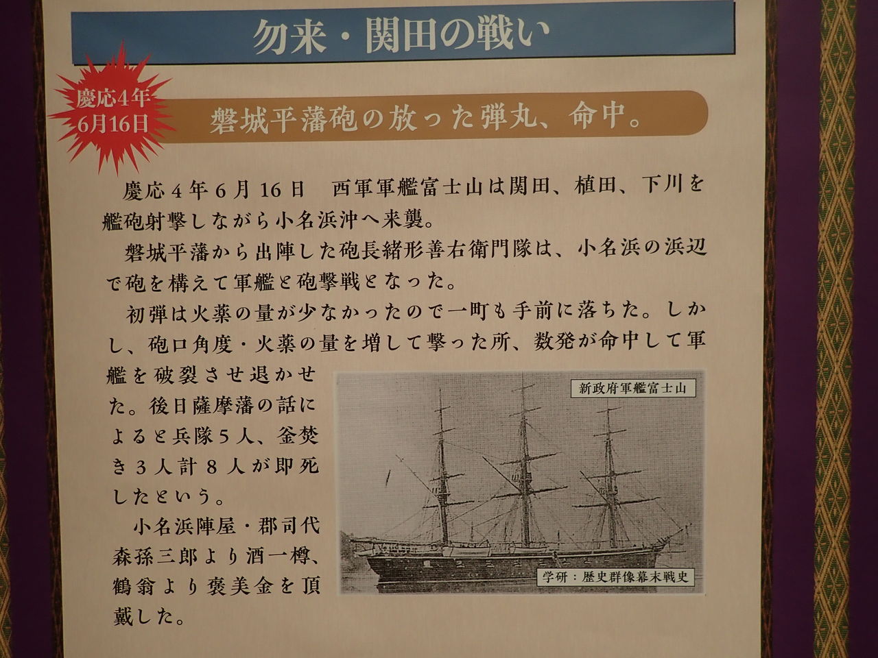 戊辰戦争で、小名浜港内で砲撃戦があった事実。東軍の陸地からの砲撃により、西軍の軍艦「富士山」に命中していたことを始めて知りました。