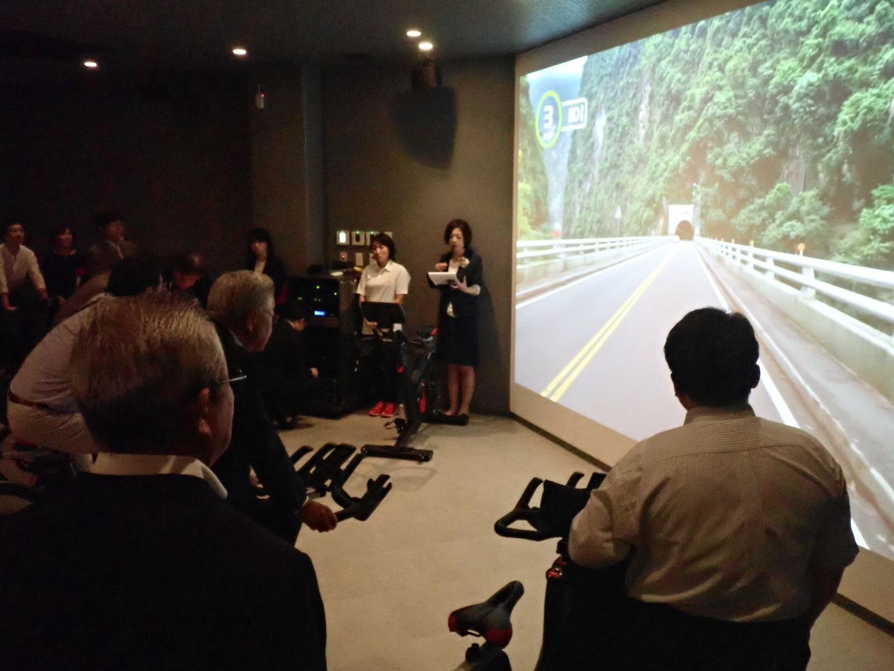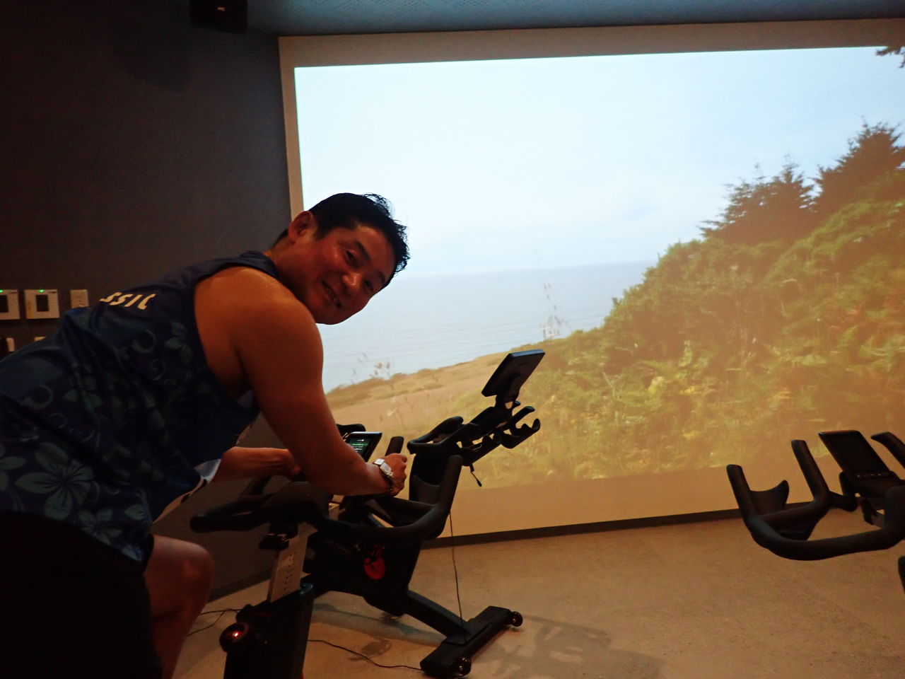 いわき初上陸!のサイクルスタジオです。風景に合わせてバイクの負荷を変えることで実際の道を走っている感覚を味わえます。負荷は自由に設定できるので、どんなレベルにも対応可能。インストラクターと一緒に全力で10数分間の体験トレーニングをさせていただきました。
