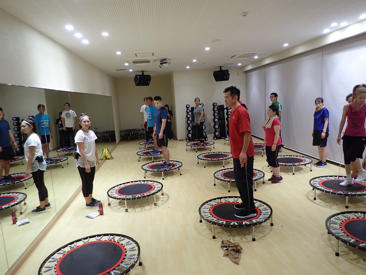 「ユーバウンド」という、一人用の小さなトランポリンを使った運動を体験しました。インストラクターと一緒に、音楽に併せてトランポリンの上で運動するというもの。トランポリンというと、なるだけ高く飛ぶというイメージがありますが、そうではなく、トランポリンを勢いよく踏みつけることで、体幹を鍛えることができるのだそうです。ビートに合わせてリズムを刻むのは、楽しくも、結構キツい。