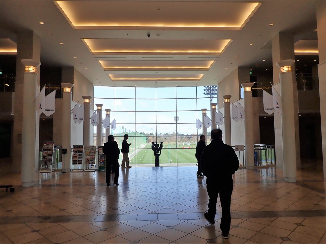 ロビーの向こうの全面ガラスの先には、青々とした天然芝のサッカーコートが3面、見えます。ここがすべて原発事故対策作業員向けの駐車場になっていたことなど、微塵も感じられません。