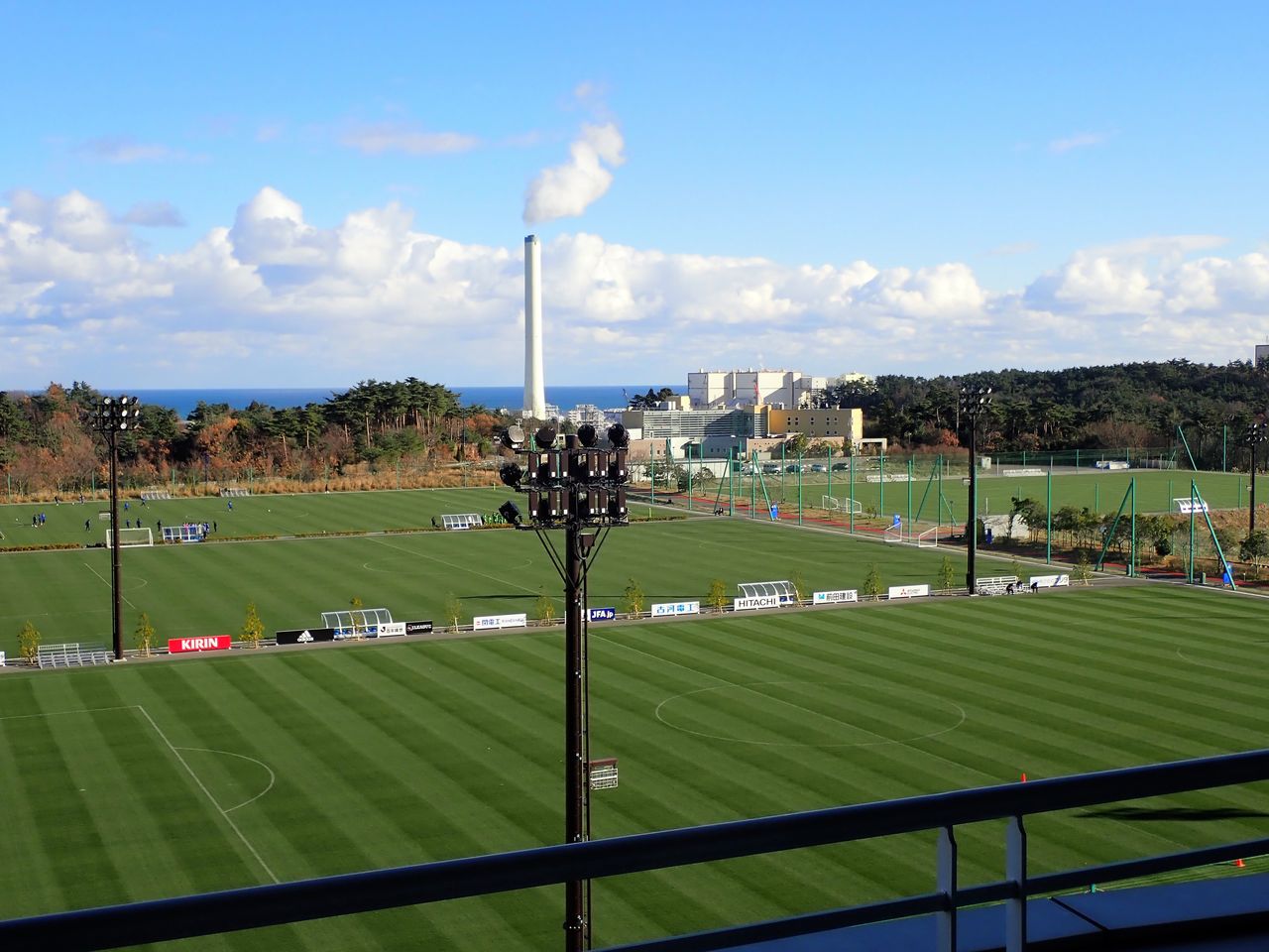遠くには広野火力発電所の煙突が見えます。その右隣の黄色い建物は、JFAアカデミー福島の量・宿舎。もともとは、日本サッカー協会が、サッカーのエリート選手を育成するために、2006年に開校したもの。アカデミー生は専用の寮に寄宿しながら、日中は地元の公立中学・高校(広野中学校、楢葉中学校、富岡高校)に通学。放課後にアカデミーで各種の教育を受けるというものでした。