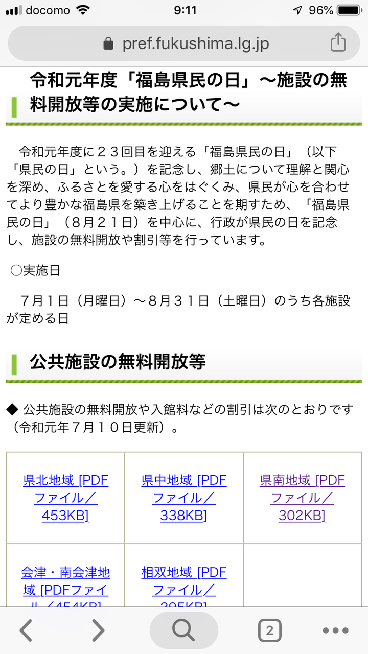 福島県民の日から、いわき市が除外されています!福島県民の日条例では、県民の日として8月21日が制定されています。なので、県内各地にある公共施設(県立博物館や体育館・プール等)では、8/21は利用料が無料とされています。しかし、いわき市での無料開放の対象施設はありません!福島県のホームページでも、それが確認できます。