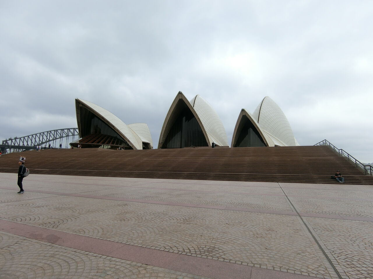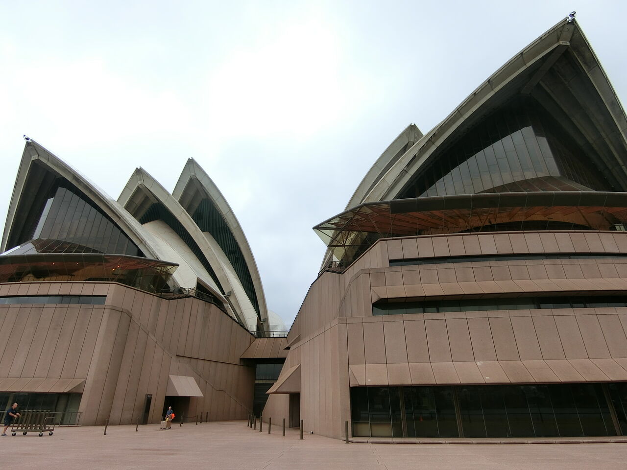 オペラハウスは純白の色のイメージですが、実際はさにあらず、白で光る素材のタイルと、べージュでざらざらのタイルのコンビネーションです。なので晴れた日は、前者が反射して真っ白に見える。逆に曇った日は、後者が強くなり、ベージュに見える。観光で紹介されているオペラハウスは、快晴の日に撮影しているので、純白のイメージが刷り込まれているんですね。