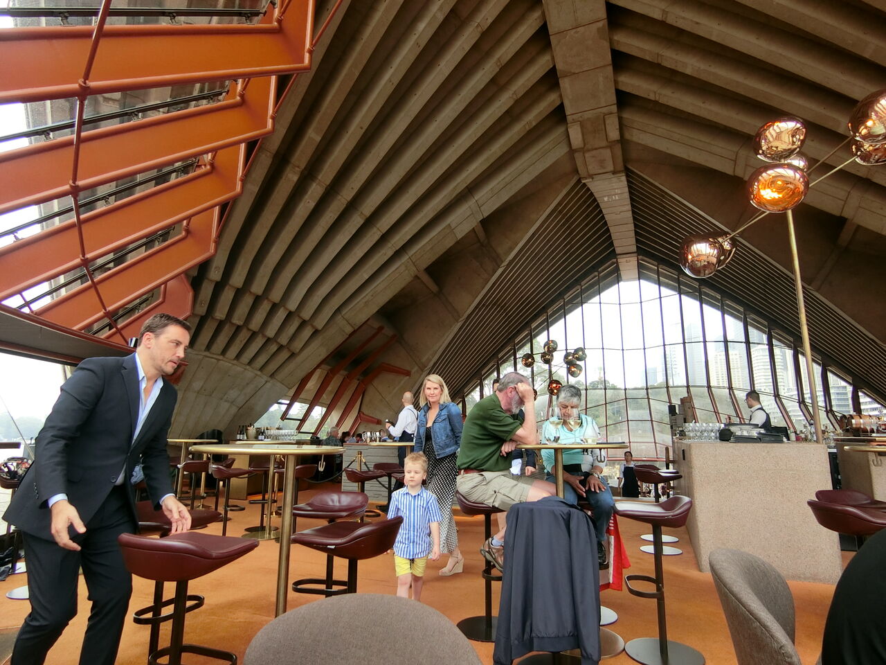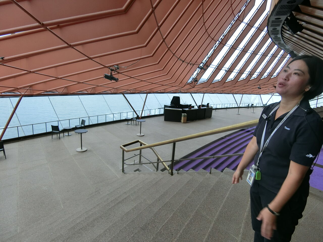 ツアーガイドさんに、シドニー湾が一望できるポイントを教えてもらいました。一番キレイに見るために、窓に傾斜を付け、人間の姿が写らないように工夫しているんだとか。シドニー湾に浮かんでいるような感覚になりました。