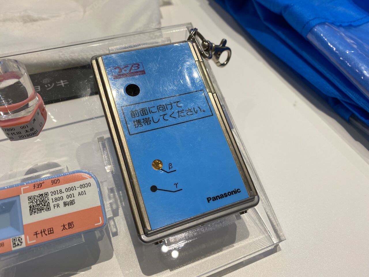 こちらが私が手渡された累計放射線量計と同じ型(Panasonic製)の実機。胸ポケットに穴が空いている方を正面に向けて使います。手渡されたときは0.0mSvでしたが、1F構内視察後の値は、0.2mSvになっていました。規定の値(例えば1.0mSvに設定しておく)を超えると、ピーピーと警報音が鳴り響き、撤退の可能性を示唆します。