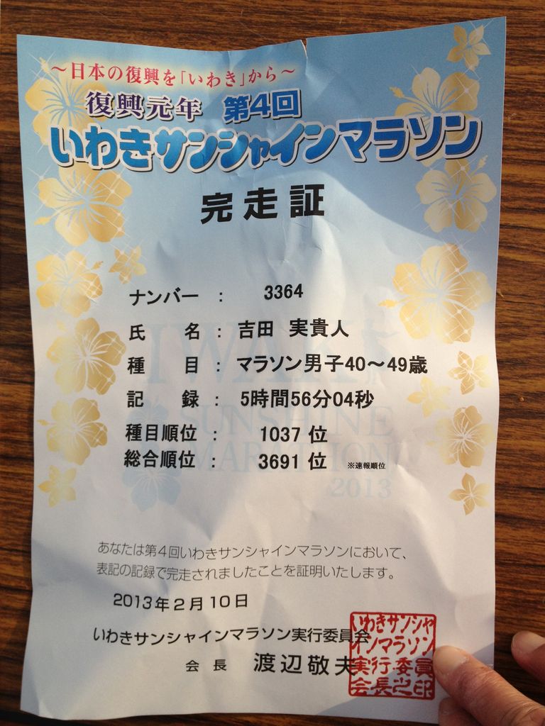 それと客単価向上について。いわき市内を周遊し、できればもう1泊するような取組みが欲しい。RunNetの口コミをざっと閲覧する限り、「いわきを応援するために参加した」「来てくれてありがとう、との沿道からの声援が嬉しい」とのコメントが多数見られます。これらの暖かい声に応えるべく、コンタクト時(申込時においては、ネット申込画面、受渡し時においてはフェイスtoフェイスで、資料送付時には封筒内の資料で)に、いわきの魅力を伝えられる体系的なモノが欲しいですね(今回頂いた資料も内容がバラバラで、店舗側の売らんかな、の意図を感じるパンフがあった)。もっともこれは実行委員会というよりも、いわきの商業者の課題ですね。